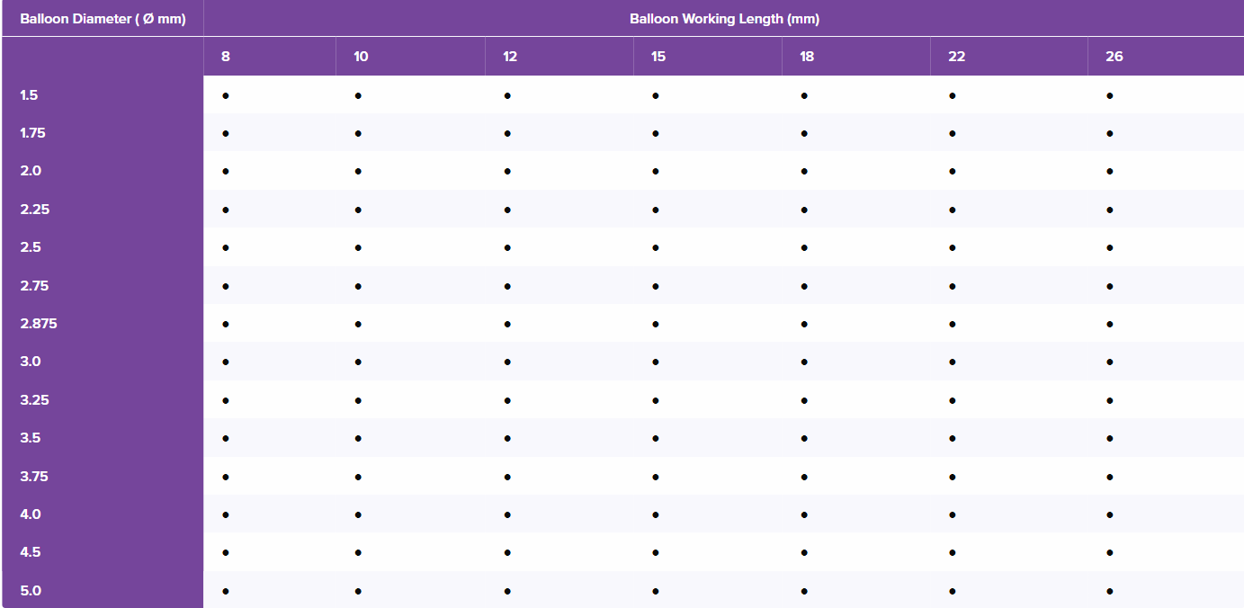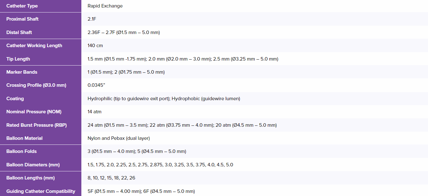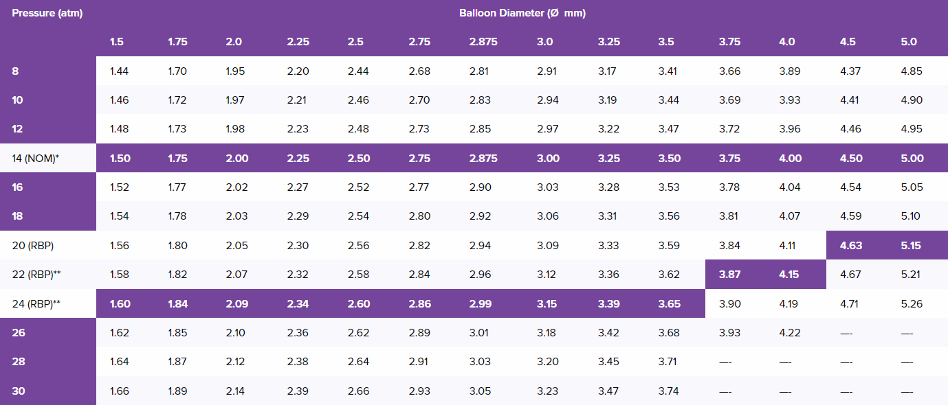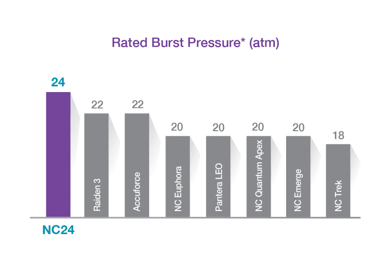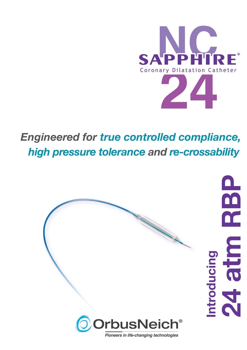 Sapphire NC24 Coronary Dilatation Catheter Optimal combination of robustness, controlled compliance, and re-crossability True Controlled Balloon Compliance Lowest % Circumferential Growth* (Nom to RBP) True Controlled Balloon Compliance Lowest % Longitudinal Growth* (Nom to RBP) High Pressure Tolerance High pressure tolerance of 24 atm RBP up to 3.5 mm diameter without compromising crossability Diameter range from 1.5 to 5.0 mm with lengths up to 26 mm for broadened range of treatment Technical Specifications Schematic Compliance Chart Available Configurations Product Downloads G-70-1063 Rev05 (Non-EU) Sapphire NC24 Brochure G-70-1069 Rev06 (EU) Sapphire NC24 Brochure